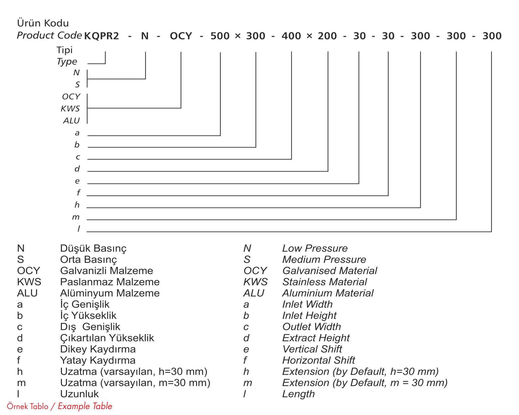 Açıklama: Redüktör farklı ebatlardaki iki tane dikdörtgen boruyu birleştirmek amacıyla kullanılmaktadır. Uçlarında metal levhalı bağlantı profili montaj çerçeveleri mevcut olup, çapraz levha ondülasyon yöntemiyle güçlendirilmiştir. Kesinti eşmerkezli bir şekilde indirgeyerek bir havalandırma sisteminin tasarlanmasını sağlar. Her iki ebadın eksenleri birbirleriyle uyumludur.