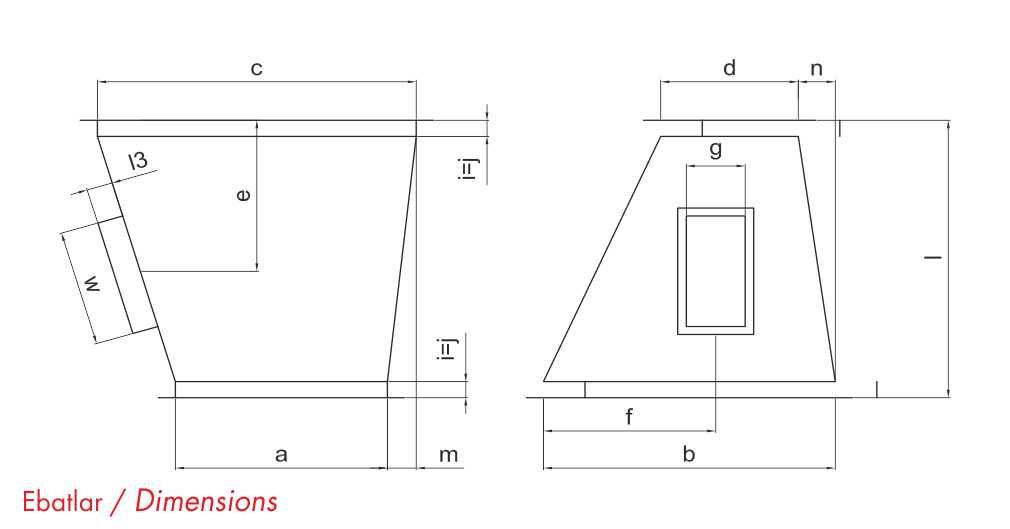 Açıklama: T – parçasının uçlarında levha metal bağlantı profili montaj çerçeveleri mevcut olup, çapraz levha ondülasyon yöntemiyle sertleştirilmiştir. T parçası sayesinde 90° bir açıyla, bir havalandırma sistemi ve herhangi bir m değeriyle çıkışı daha kısa olan bir çıkış redüksiyonu tasarlanabilir. Ek olarak çıkış T parçasınınkinden daha farklı bir yüksekliğe sahip olabilir.