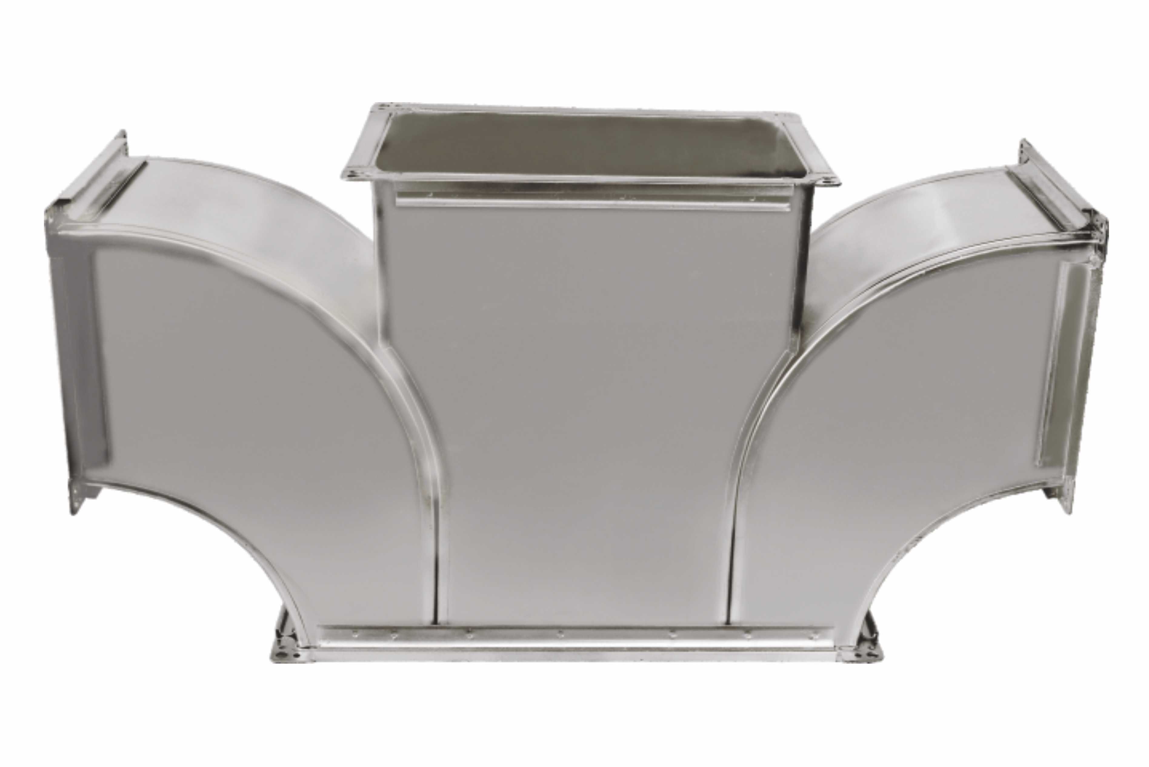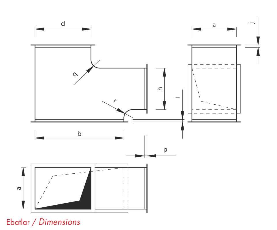 Açıklama: T – parçasının uçlarında levha metal bağlantı profili montaj çerçeveleri mevcut olup, çapraz levha ondülasyon yöntemiyle sertleştirilmiştir. Bağlantı parçası sayesinde 90° bir açıyla, bir havalandırma sistemi tasarlanabilir. T – parçasının yüksekliği sabittir.