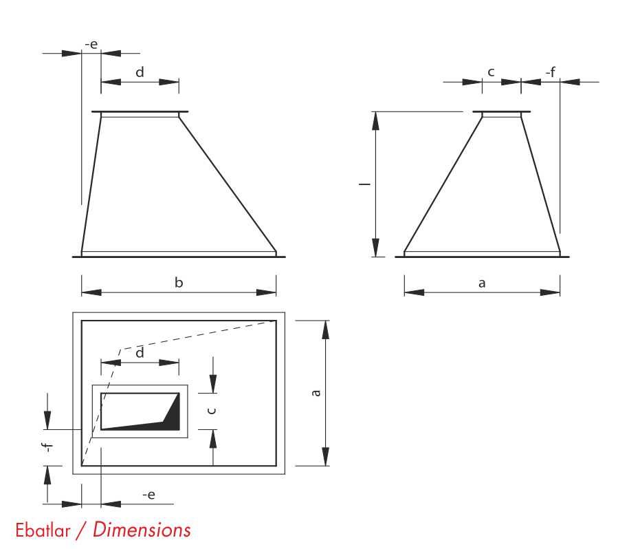 Açıklama: Redüktör farklı ebatlardaki iki tane dikdörtgen boruyu birleştirmek amacıyla kullanılmaktadır. Uçlarında metal levhalı bağlantı profili montaj çerçeveleri mevcut olup, çapraz levha ondülasyon yöntemiyle güçlendirilmiştir. Kesinti eşmerkezli bir şekilde indirgeyerek bir havalandırma sisteminin tasarlanmasını sağlar. Her iki ebadın eksenleri birbirleriyle uyumludur.